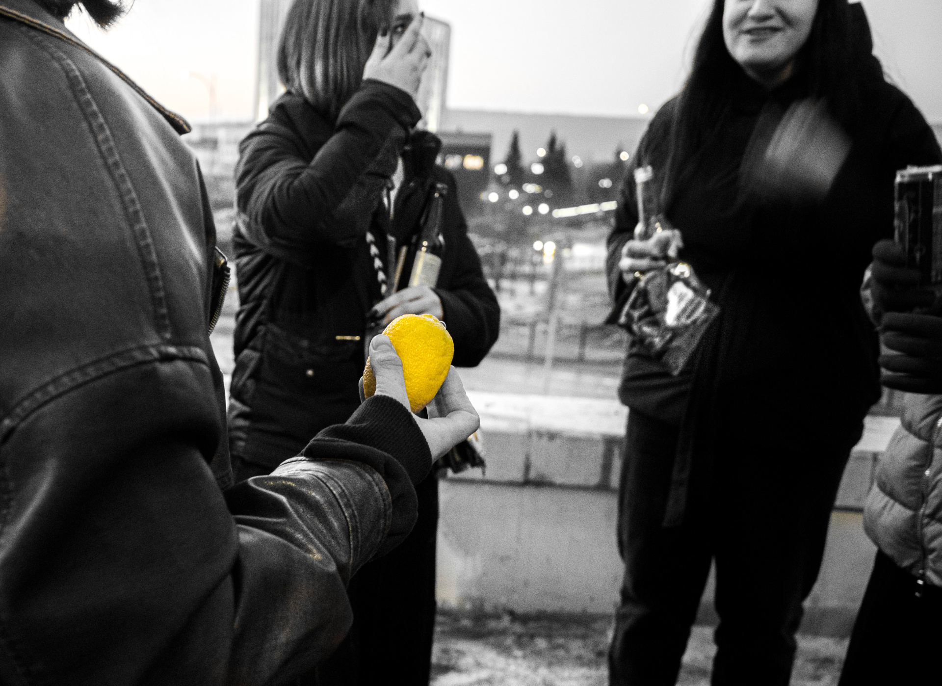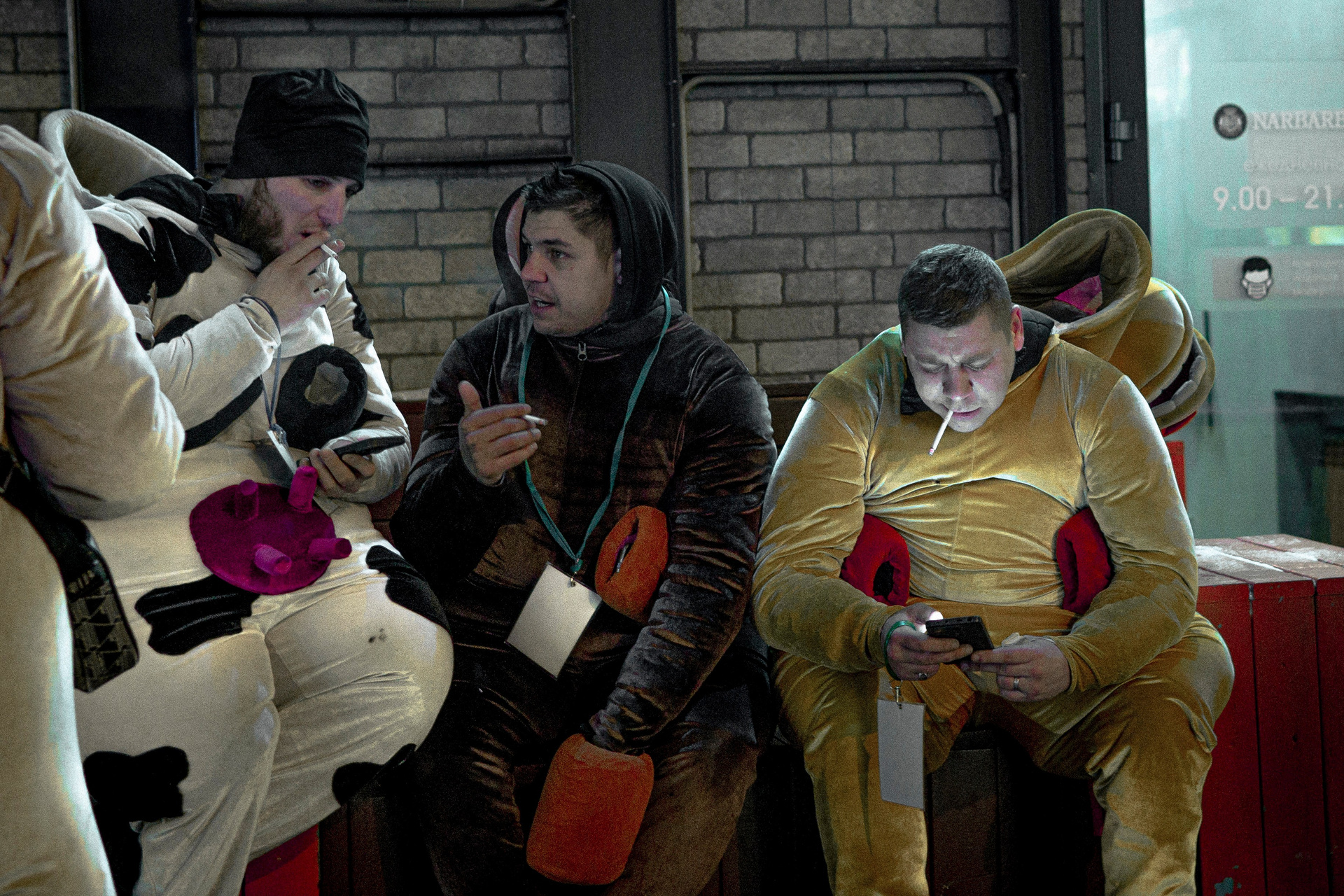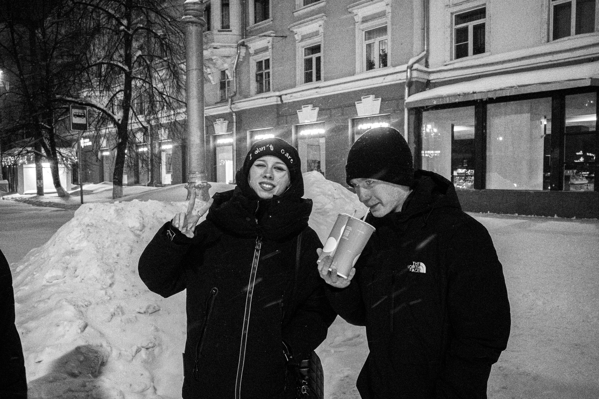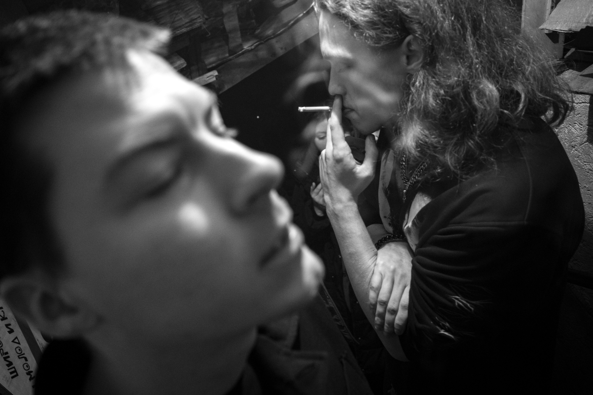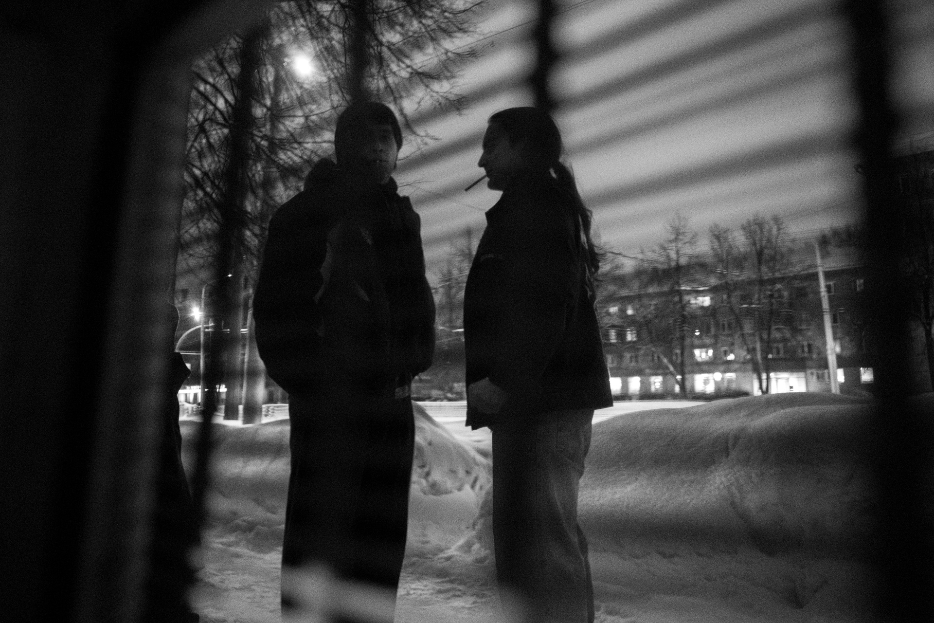 Laughter erupts without joy, then dissolves back into the damp. This is not decay—it is simply the way the hours pass when the streetlights are too dim to cast a proper shadow. Smoke blurs the boundary between face and night air.